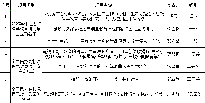 近日,全国民办高校课程思政联盟陆续公布2025年课程思政教学改革研究项目立项名单、课程思政优秀案例征集结果及课程思政微课教学比赛获奖情况。我校获批3项课程思政教学改革研究项目(含1项重点),微课比赛一二三等奖各1项,入选全国民办高校课程思政优秀案例1项,充分彰显了我校在课程思政建设领域的特色成效与育人实力。